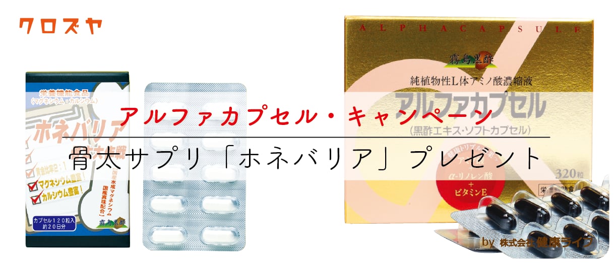 ⭐️ホネバリア・プレゼントキャンペーン⭐️ 2026年3月23日午後3時までのご注文で、ホネバリア30粒をプレゼントします。 毎日の健康に欠かせないアミノ酸を、安心して高単位に摂ることのできる植物由来のサプリメントです。 4種類の穀類(大麦、玄米、黒大豆、米糠)をそれぞれに適した麹菌で分解し、アミノ酸エキスを作ります。 こうして作った4種類のアミノ酸エキスを、体に必要なアミノ酸バランスを考慮してブレンドします。 ブレンドした黒酢エキスを、霧島黒酢独自の濃縮法でアミノ酸成分を変質することなくさらに高濃度に濃縮します。 これらの超濃縮黒酢エキス(L体複合アミノ酸エキス)を、飲みやすいカプセルに詰め込みました。 アルファカプセルに含まれるアミノ酸は、遊離アミノ酸の状態になっています。 健康な体では、アミノ酸は血液中に溶け込んで体内を循環し、必要なときにすぐに使える状態になっています。 この状態を遊離アミノ酸といいます。 20種類のアミノ酸をバランス良く豊富に含み、遊離アミノ酸の状態で補給出来るのがアルファカプセルです。 ■品名:アミノ酸エキス含有加工食品 ■原材料:アミノ酸濃縮エキス(大麦黒酢エキス、玄米黒酢エキス、黒大豆エキス、米糠エキス)、亜麻仁油、ビタミンE含有植物油、ゼラチン、グリセリン、ミツロウ ■栄養成分:熱量12kcal、タンパク質0.8g、脂質0.7g、炭水化物0.5g、食塩相当量0.001mg 、ビタミンE(αトコフェロール)27.7mg、αリノレン酸323mg、アミノ酸586.8mg(3粒あたり、1粒重量は750mg) 栄養素等表示基準値2015(18歳以上、基準熱量2,200kcal)に占める割合 ・ビタミンE 439% ■製造元:株式会社ジェイシーエヌ霧島工場 ■使用上の注意 :カプセルは包装から取り出してゼラチンカプセルごとお飲みください。 高温多湿を避け、開封後はお早めにお召し上がり下さい。特に夏場の車内などでの放置は中身が分離やカプセルの白濁などの恐れがあります。 本品は、多量摂取により疾病が治癒したり、より健康が増進するものではありません。1日の摂取目安量を守ってください。 本品は、特定保健用食品と異なり、消費者庁長官による個別審査を受けたものではありません。 食生活は、主食、主菜、副菜を基本に、食事のバランスを。
